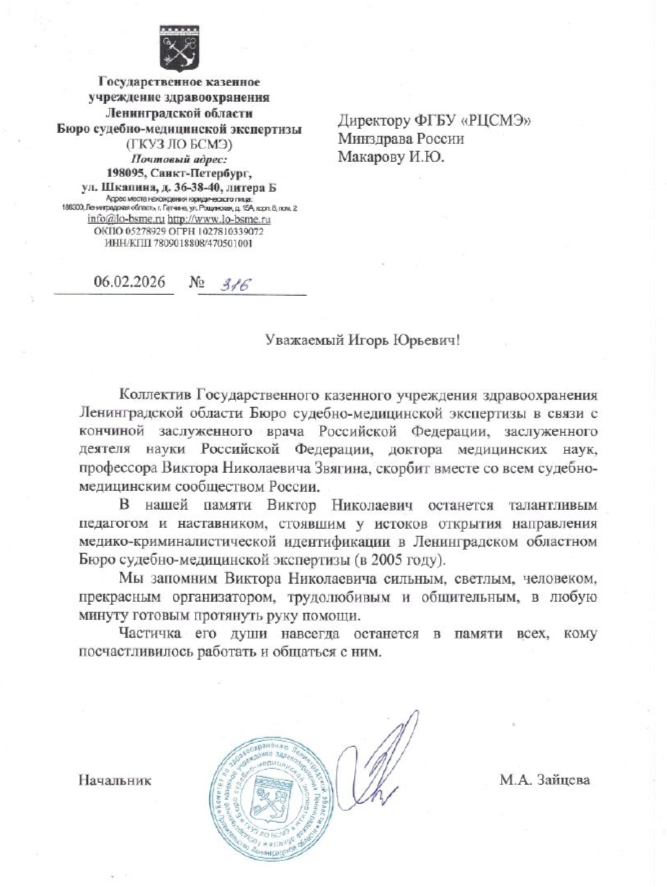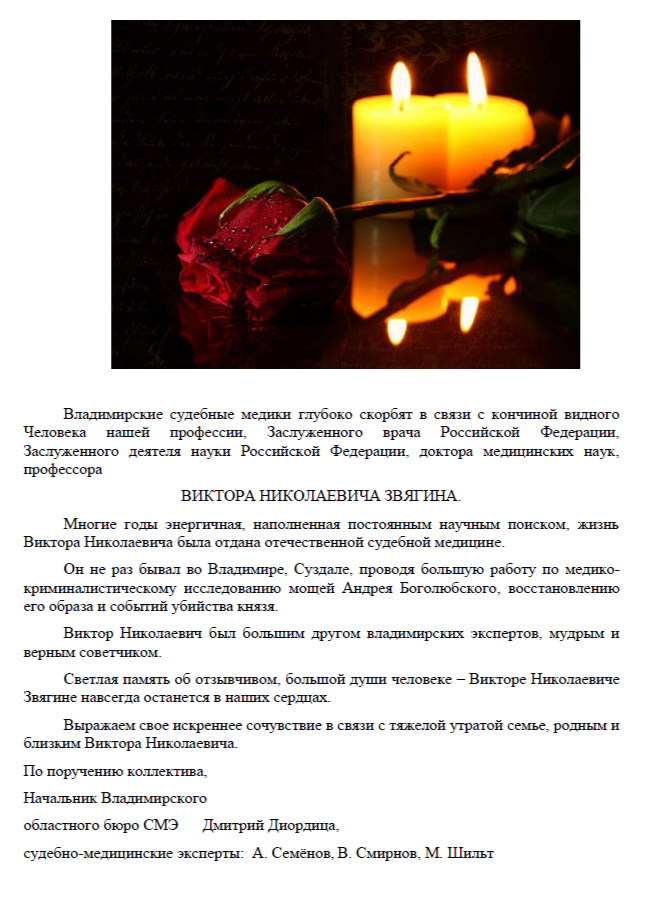 Коллектив Российского центра судебно-медицинской экспертизы Минздрава России благодарит всех коллег за сердечную поддержку, искренние и добрые слова в честь профессора Виктора Николаевича Звягина.