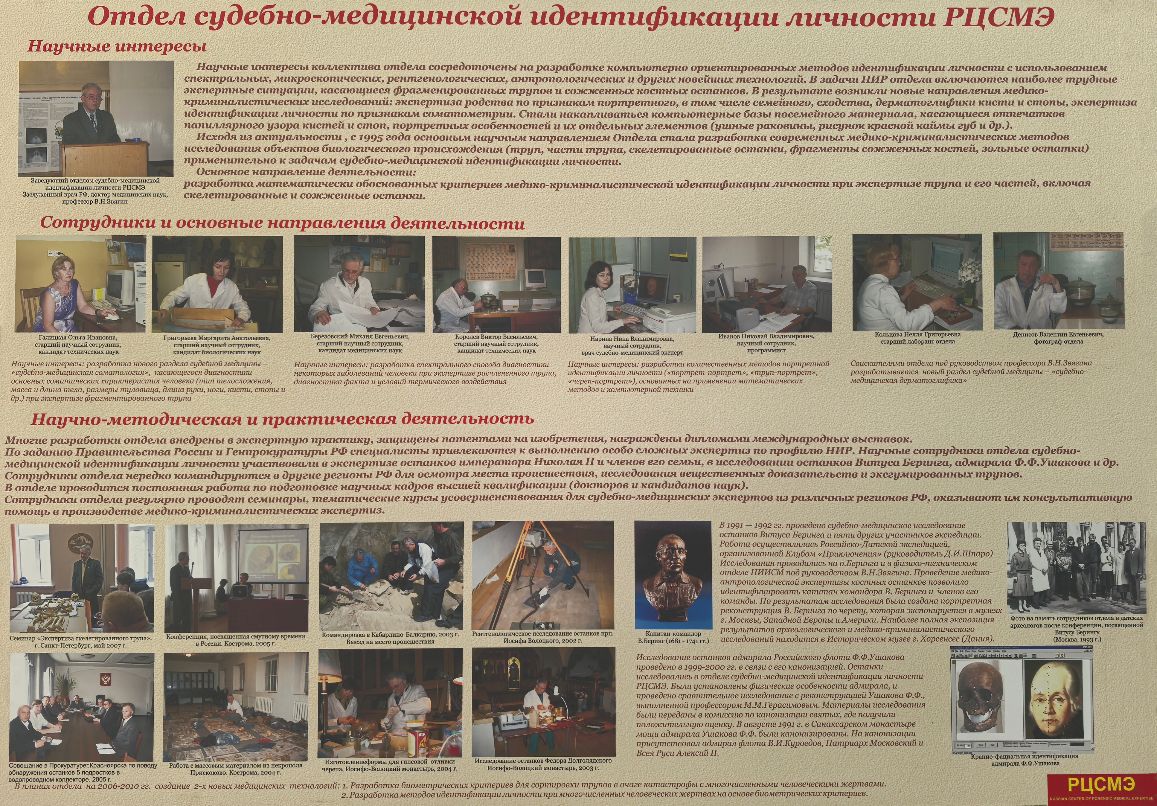 – «Опыт медико-криминалистического исследования захоронений исторических и социально-значимых лиц», автор: заведующий лабораторией судебно-медицинских остеологических исследований, Заслуженный врач Российской Федерации, Заслуженный деятель науки Российской Федерации, д.м.н., профессор В.Н. Звягин;